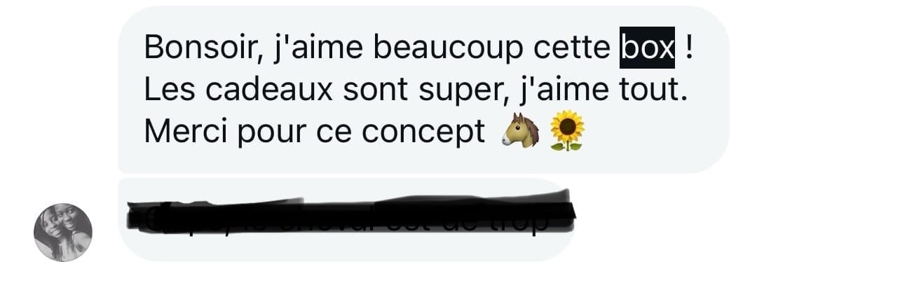 ‘’Je suis tombée sur cette box par hasard et c’est une très belle surprise. Le concept est vraiment très sympa, et la box très complète, les surprises sont super ! J’ai hâte de pouvoir commander la prochaine !’’